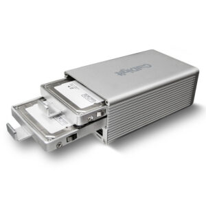 The back of the VR mini 2 has two removable Drive Modules. These removable drives allow you to expand the storage of your bus powered RAID. You will find that other RAID devices do not have this function. Many CalDigit customers use the VR mini 2 on location to back up data, and take out the Drive Modules in order to send them back to their post production facility to start working with the footage. This creates a seamless workflow that gives you RAID protection in the field, and a streamlined post production workflow, based around moving the VR mini 2’s Drive Modules from the shoot to the edit. This is a truly powerful solution that only CalDigit can offer. The VR mini 2’s Drive Modules are also hot swappable. This means that you do not even have to turn off the VR mini 2 before taking them out.